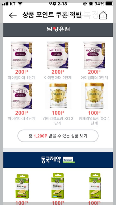 OK(오케이)캐시백을 적립할 수 있는 상품, 맥심, 남양유업, 동국제약 제품들이 보입니다.